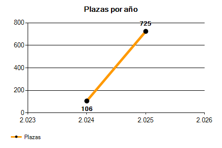 En los siguientes gráficos se puede ver la evolución del número de convocatorias y plazas convocadas por Ministerio de Educación, Formación Profesional y Deportes de los últimos años pudiéndose observar una caída del 50,00% desde el año 2024 hasta el 2025 en número de convocatorias y un crecimiento del 583,96% en número de plazas convocadas.