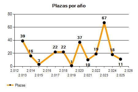 En los siguientes gráficos se puede ver la evolución del número de convocatorias y plazas convocadas por el ayuntamiento de Alcoy-Alcoi de los últimos años pudiéndose observar una caída del 35,71% desde el año 2013 hasta el 2025 en número de convocatorias y una caída del 71,79% en número de plazas convocadas.