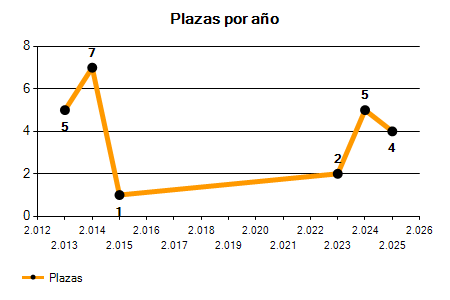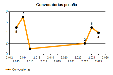 En los siguientes gráficos se puede ver la evolución del número de convocatorias y plazas convocadas por el ayuntamiento de Alfaro de los últimos años pudiéndose observar una caída del 20,00% desde el año 2013 hasta el 2025 en número de convocatorias y una caída del 20,00% en número de plazas convocadas.