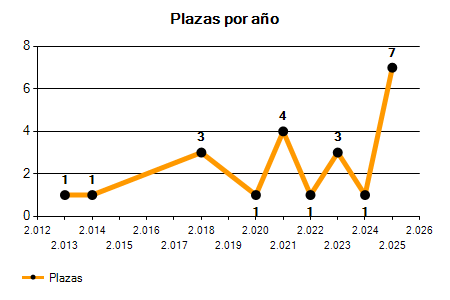 En los siguientes gráficos se puede ver la evolución del número de convocatorias y plazas convocadas por el ayuntamiento de Algaida de los últimos años pudiéndose observar un crecimiento del 25,00% desde el año 2013 hasta el 2025 en número de convocatorias y un crecimiento del 600,00% en número de plazas convocadas.