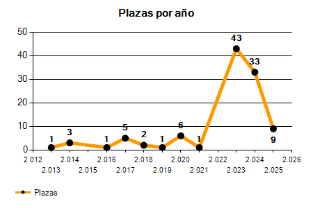 En los siguientes gráficos se puede ver la evolución del número de convocatorias y plazas convocadas por el ayuntamiento de Almansa de los últimos años pudiéndose observar un crecimiento del 300,00% desde el año 2013 hasta el 2025 en número de convocatorias y un crecimiento del 800,00% en número de plazas convocadas.
