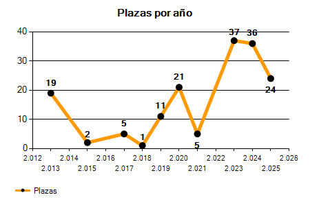 En los siguientes gráficos se puede ver la evolución del número de convocatorias y plazas convocadas por el ayuntamiento de Alzira de los últimos años pudiéndose observar una caída del 25,00% desde el año 2013 hasta el 2025 en número de convocatorias y un crecimiento del 26,32% en número de plazas convocadas.