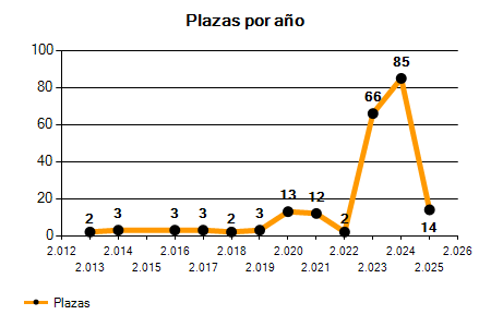 En los siguientes gráficos se puede ver la evolución del número de convocatorias y plazas convocadas por el ayuntamiento de Amposta de los últimos años pudiéndose observar un crecimiento del 350,00% desde el año 2013 hasta el 2025 en número de convocatorias y un crecimiento del 600,00% en número de plazas convocadas.
