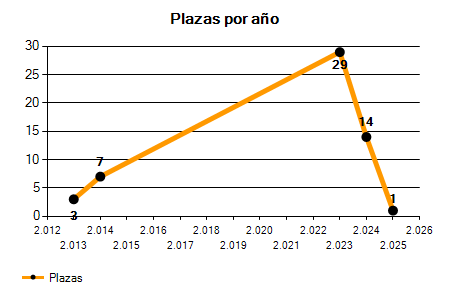 En los siguientes gráficos se puede ver la evolución del número de convocatorias y plazas convocadas por el ayuntamiento de Antigua de los últimos años pudiéndose observar una caída del 66,67% desde el año 2013 hasta el 2025 en número de convocatorias y una caída del 66,67% en número de plazas convocadas.