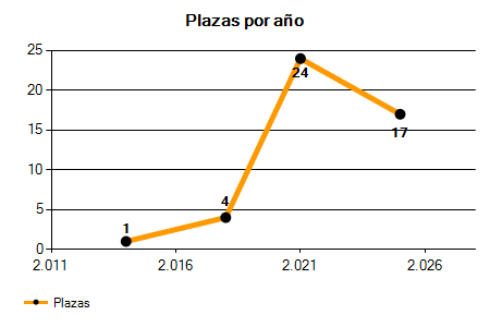 En los siguientes gráficos se puede ver la evolución del número de convocatorias y plazas convocadas por el ayuntamiento de Arahal de los últimos años pudiéndose observar un crecimiento del 400,00% desde el año 2014 hasta el 2025 en número de convocatorias y un crecimiento del 1.600,00% en número de plazas convocadas.
