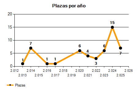 En los siguientes gráficos se puede ver la evolución del número de convocatorias y plazas convocadas por el ayuntamiento de Arrasate-Mondragón de los últimos años pudiéndose observar un crecimiento del 400,00% desde el año 2013 hasta el 2025 en número de convocatorias y un crecimiento del 600,00% en número de plazas convocadas.