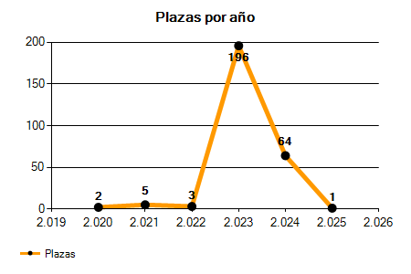 En los siguientes gráficos se puede ver la evolución del número de convocatorias y plazas convocadas por el ayuntamiento de Arucas de los últimos años pudiéndose observar una caída del 50,00% desde el año 2020 hasta el 2025 en número de convocatorias y una caída del 50,00% en número de plazas convocadas.