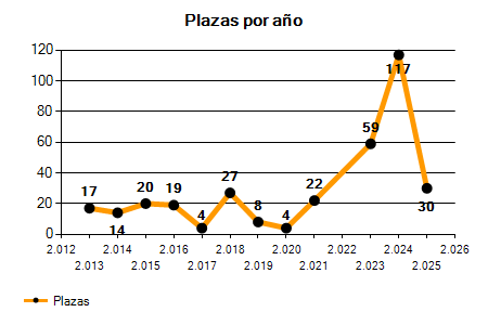 En los siguientes gráficos se puede ver la evolución del número de convocatorias y plazas convocadas por el ayuntamiento de Ávila de los últimos años pudiéndose observar un crecimiento del 83,33% desde el año 2013 hasta el 2025 en número de convocatorias y un crecimiento del 76,47% en número de plazas convocadas.