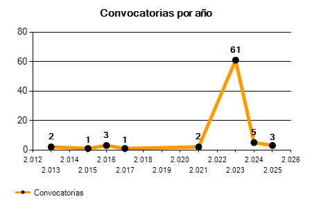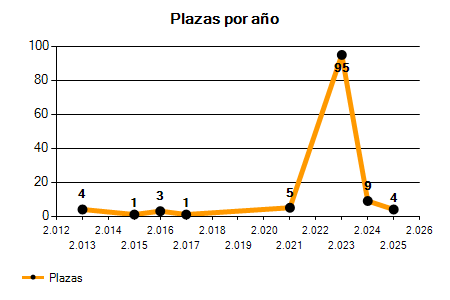 En los siguientes gráficos se puede ver la evolución del número de convocatorias y plazas convocadas por el ayuntamiento de Baeza de los últimos años pudiéndose observar un crecimiento del 50,00% desde el año 2013 hasta el 2025 en número de convocatorias y un crecimiento y una caída del 0,00% en número de plazas convocadas.