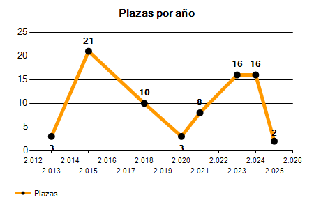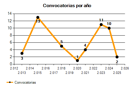 En los siguientes gráficos se puede ver la evolución del número de convocatorias y plazas convocadas por el ayuntamiento de Bullas de los últimos años pudiéndose observar una caída del 33,33% desde el año 2013 hasta el 2025 en número de convocatorias y una caída del 33,33% en número de plazas convocadas.