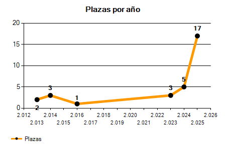 En los siguientes gráficos se puede ver la evolución del número de convocatorias y plazas convocadas por el ayuntamiento de Calatayud de los últimos años pudiéndose observar un crecimiento del 400,00% desde el año 2013 hasta el 2025 en número de convocatorias y un crecimiento del 750,00% en número de plazas convocadas.