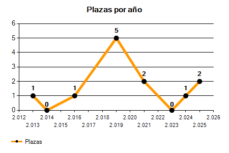 En los siguientes gráficos se puede ver la evolución del número de convocatorias y plazas convocadas por el ayuntamiento de Campos de los últimos años pudiéndose observar una caída del 66,67% desde el año 2013 hasta el 2025 en número de convocatorias y un crecimiento del 100,00% en número de plazas convocadas.