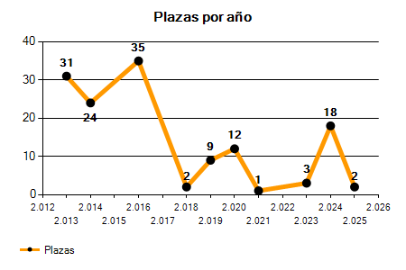 En los siguientes gráficos se puede ver la evolución del número de convocatorias y plazas convocadas por el ayuntamiento de Carballo de los últimos años pudiéndose observar una caída del 84,62% desde el año 2013 hasta el 2025 en número de convocatorias y una caída del 93,55% en número de plazas convocadas.