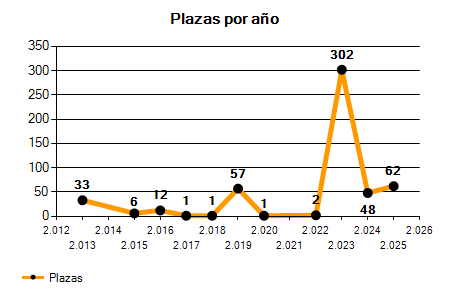 En los siguientes gráficos se puede ver la evolución del número de convocatorias y plazas convocadas por el ayuntamiento de Castellón de la Plana-Castelló de la Plana de los últimos años pudiéndose observar un crecimiento del 357,14% desde el año 2013 hasta el 2025 en número de convocatorias y un crecimiento del 87,88% en número de plazas convocadas.