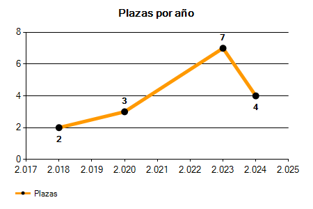 En los siguientes gráficos se puede ver la evolución del número de convocatorias y plazas convocadas por el ayuntamiento de Cazalla de la Sierra de los últimos años pudiéndose observar una caída del 100,00% desde el año 2018 hasta el 2025 en número de convocatorias y una caída del 100,00% en número de plazas convocadas.