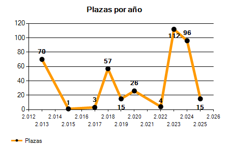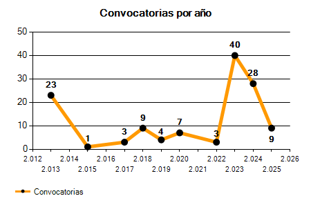 En los siguientes gráficos se puede ver la evolución del número de convocatorias y plazas convocadas por el ayuntamiento de Ceuta de los últimos años pudiéndose observar una caída del 60,87% desde el año 2013 hasta el 2025 en número de convocatorias y una caída del 78,57% en número de plazas convocadas.