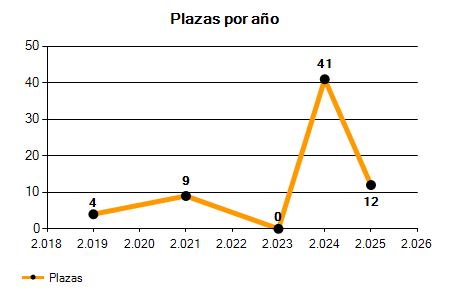 En los siguientes gráficos se puede ver la evolución del número de convocatorias y plazas convocadas por el ayuntamiento de Ciutadella de Menorca de los últimos años pudiéndose observar un crecimiento del 400,00% desde el año 2019 hasta el 2025 en número de convocatorias y un crecimiento del 200,00% en número de plazas convocadas.