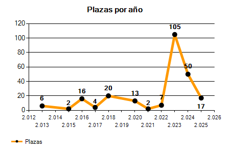 En los siguientes gráficos se puede ver la evolución del número de convocatorias y plazas convocadas por el ayuntamiento de Colmenar Viejo de los últimos años pudiéndose observar un crecimiento y una caída del 0,00% desde el año 2013 hasta el 2025 en número de convocatorias y un crecimiento del 183,33% en número de plazas convocadas.