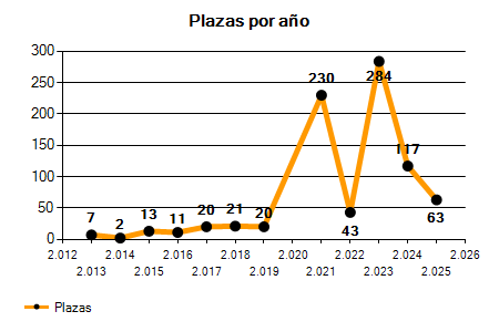 En los siguientes gráficos se puede ver la evolución del número de convocatorias y plazas convocadas por el ayuntamiento de Coruña (A) de los últimos años pudiéndose observar un crecimiento del 266,67% desde el año 2013 hasta el 2025 en número de convocatorias y un crecimiento del 800,00% en número de plazas convocadas.