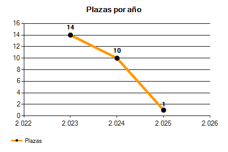 En los siguientes gráficos se puede ver la evolución del número de convocatorias y plazas convocadas por el ayuntamiento de Creixell de los últimos años pudiéndose observar una caída del 90,91% desde el año 2023 hasta el 2025 en número de convocatorias y una caída del 92,86% en número de plazas convocadas.