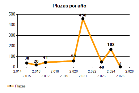 En los siguientes gráficos se puede ver la evolución del número de convocatorias y plazas convocadas por el ayuntamiento de Dos Hermanas de los últimos años pudiéndose observar una caída del 77,78% desde el año 2015 hasta el 2025 en número de convocatorias y una caída del 94,74% en número de plazas convocadas.