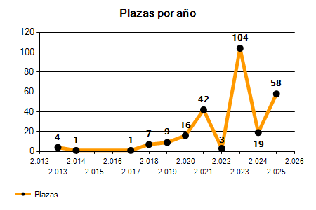 En los siguientes gráficos se puede ver la evolución del número de convocatorias y plazas convocadas por el ayuntamiento de Elda de los últimos años pudiéndose observar un crecimiento del 500,00% desde el año 2013 hasta el 2025 en número de convocatorias y un crecimiento del 1.350,00% en número de plazas convocadas.