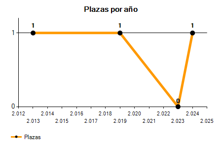 En los siguientes gráficos se puede ver la evolución del número de convocatorias y plazas convocadas por el ayuntamiento de Estellencs de los últimos años pudiéndose observar una caída del 100,00% desde el año 2013 hasta el 2025 en número de convocatorias y una caída del 100,00% en número de plazas convocadas.