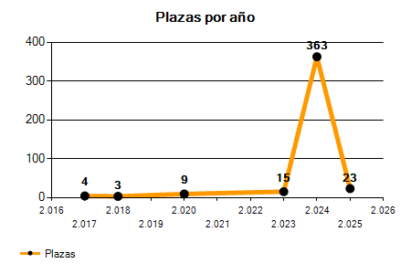 En los siguientes gráficos se puede ver la evolución del número de convocatorias y plazas convocadas por el ayuntamiento de Estepona de los últimos años pudiéndose observar un crecimiento del 500,00% desde el año 2017 hasta el 2025 en número de convocatorias y un crecimiento del 475,00% en número de plazas convocadas.