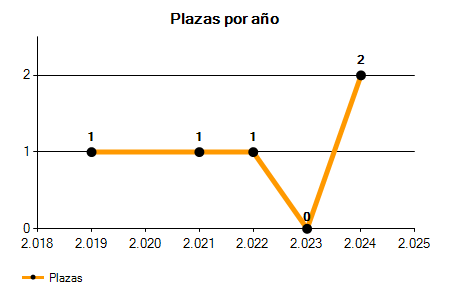 En los siguientes gráficos se puede ver la evolución del número de convocatorias y plazas convocadas por el ayuntamiento de Grazalema de los últimos años pudiéndose observar una caída del 100,00% desde el año 2019 hasta el 2025 en número de convocatorias y una caída del 100,00% en número de plazas convocadas.