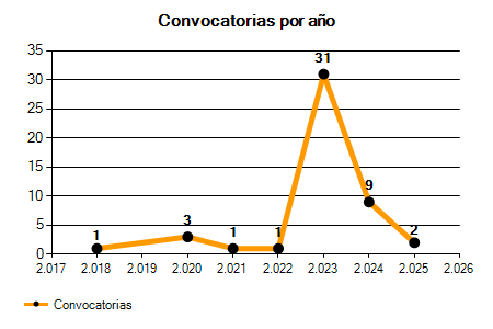 En los siguientes gráficos se puede ver la evolución del número de convocatorias y plazas convocadas por el ayuntamiento de Griñón de los últimos años pudiéndose observar un crecimiento del 100,00% desde el año 2018 hasta el 2025 en número de convocatorias y un crecimiento del 100,00% en número de plazas convocadas.