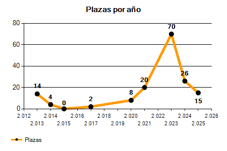 En los siguientes gráficos se puede ver la evolución del número de convocatorias y plazas convocadas por el ayuntamiento de Hellín de los últimos años pudiéndose observar un crecimiento del 450,00% desde el año 2013 hasta el 2025 en número de convocatorias y un crecimiento del 7,14% en número de plazas convocadas.