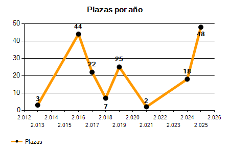 En los siguientes gráficos se puede ver la evolución del número de convocatorias y plazas convocadas por el ayuntamiento de Jaén de los últimos años pudiéndose observar un crecimiento del 500,00% desde el año 2013 hasta el 2025 en número de convocatorias y un crecimiento del 1.500,00% en número de plazas convocadas.