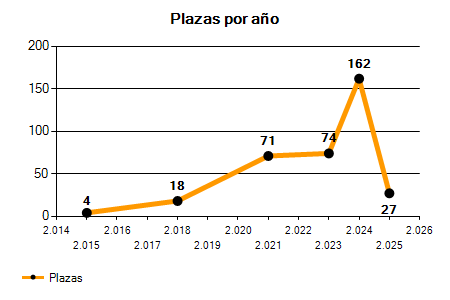 En los siguientes gráficos se puede ver la evolución del número de convocatorias y plazas convocadas por el ayuntamiento de Jerez de la Frontera de los últimos años pudiéndose observar un crecimiento del 100,00% desde el año 2015 hasta el 2025 en número de convocatorias y un crecimiento del 575,00% en número de plazas convocadas.
