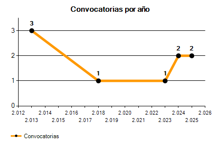 En los siguientes gráficos se puede ver la evolución del número de convocatorias y plazas convocadas por el ayuntamiento de Lloret de Vistalegre de los últimos años pudiéndose observar una caída del 33,33% desde el año 2013 hasta el 2025 en número de convocatorias y un crecimiento del 100,00% en número de plazas convocadas.