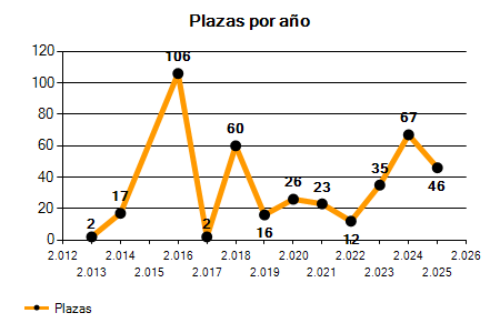 En los siguientes gráficos se puede ver la evolución del número de convocatorias y plazas convocadas por el ayuntamiento de Logroño de los últimos años pudiéndose observar un crecimiento del 550,00% desde el año 2013 hasta el 2025 en número de convocatorias y un crecimiento del 2.200,00% en número de plazas convocadas.