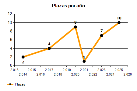 En los siguientes gráficos se puede ver la evolución del número de convocatorias y plazas convocadas por el ayuntamiento de Mairena del Alcor de los últimos años pudiéndose observar un crecimiento del 400,00% desde el año 2014 hasta el 2025 en número de convocatorias y un crecimiento del 400,00% en número de plazas convocadas.