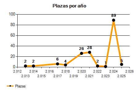 En los siguientes gráficos se puede ver la evolución del número de convocatorias y plazas convocadas por el ayuntamiento de Majadahonda de los últimos años pudiéndose observar un crecimiento del 200,00% desde el año 2013 hasta el 2025 en número de convocatorias y un crecimiento del 150,00% en número de plazas convocadas.