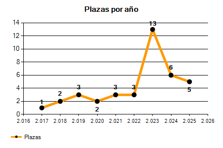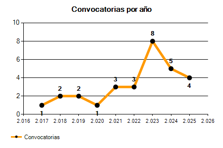En los siguientes gráficos se puede ver la evolución del número de convocatorias y plazas convocadas por el ayuntamiento de Monóvar-Monòver de los últimos años pudiéndose observar un crecimiento del 300,00% desde el año 2017 hasta el 2025 en número de convocatorias y un crecimiento del 400,00% en número de plazas convocadas.
