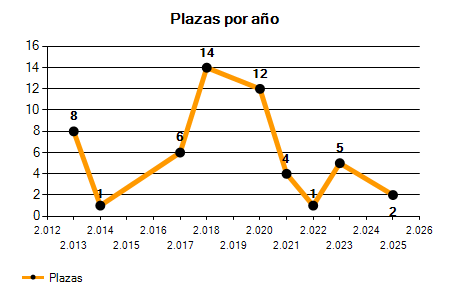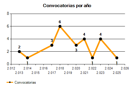 En los siguientes gráficos se puede ver la evolución del número de convocatorias y plazas convocadas por el ayuntamiento de Montilla de los últimos años pudiéndose observar una caída del 50,00% desde el año 2013 hasta el 2025 en número de convocatorias y una caída del 75,00% en número de plazas convocadas.