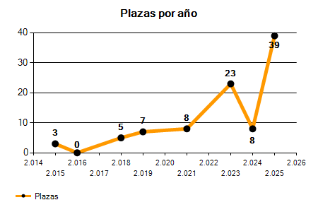 En los siguientes gráficos se puede ver la evolución del número de convocatorias y plazas convocadas por el ayuntamiento de Orotava (La) de los últimos años pudiéndose observar un crecimiento del 500,00% desde el año 2015 hasta el 2025 en número de convocatorias y un crecimiento del 1.200,00% en número de plazas convocadas.