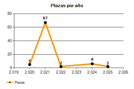 En los siguientes gráficos se puede ver la evolución del número de convocatorias y plazas convocadas por el ayuntamiento de Ortigueira de los últimos años pudiéndose observar una caída del 50,00% desde el año 2020 hasta el 2025 en número de convocatorias y una caída del 60,00% en número de plazas convocadas.