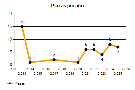 En los siguientes gráficos se puede ver la evolución del número de convocatorias y plazas convocadas por el ayuntamiento de Pájara de los últimos años pudiéndose observar una caída del 50,00% desde el año 2013 hasta el 2025 en número de convocatorias y una caída del 53,33% en número de plazas convocadas.