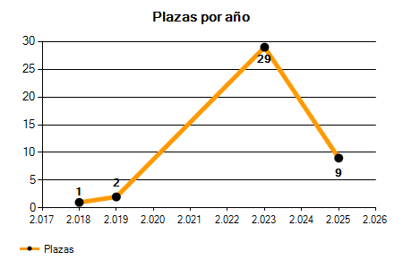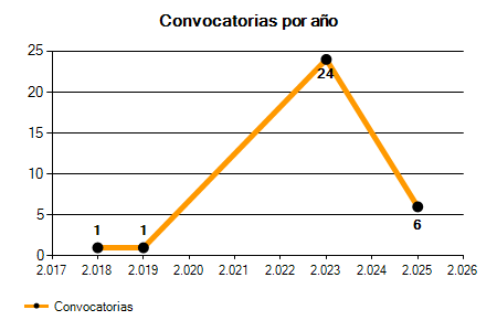 En los siguientes gráficos se puede ver la evolución del número de convocatorias y plazas convocadas por el ayuntamiento de Porcuna de los últimos años pudiéndose observar un crecimiento del 500,00% desde el año 2018 hasta el 2025 en número de convocatorias y un crecimiento del 800,00% en número de plazas convocadas.