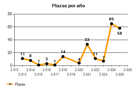 En los siguientes gráficos se puede ver la evolución del número de convocatorias y plazas convocadas por el ayuntamiento de Pozuelo de Alarcón de los últimos años pudiéndose observar un crecimiento del 45,45% desde el año 2013 hasta el 2025 en número de convocatorias y un crecimiento del 427,27% en número de plazas convocadas.