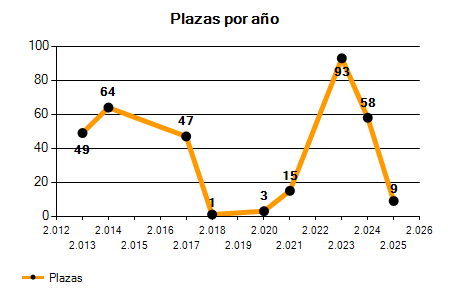 En los siguientes gráficos se puede ver la evolución del número de convocatorias y plazas convocadas por el ayuntamiento de Puerto del Rosario de los últimos años pudiéndose observar una caída del 77,27% desde el año 2013 hasta el 2025 en número de convocatorias y una caída del 81,63% en número de plazas convocadas.