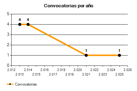 En los siguientes gráficos se puede ver la evolución del número de convocatorias y plazas convocadas por el ayuntamiento de Rincón de Soto de los últimos años pudiéndose observar una caída del 75,00% desde el año 2013 hasta el 2025 en número de convocatorias y una caída del 75,00% en número de plazas convocadas.