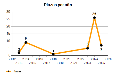 En los siguientes gráficos se puede ver la evolución del número de convocatorias y plazas convocadas por el ayuntamiento de Roquetes de los últimos años pudiéndose observar un crecimiento del 250,00% desde el año 2013 hasta el 2025 en número de convocatorias y un crecimiento del 250,00% en número de plazas convocadas.