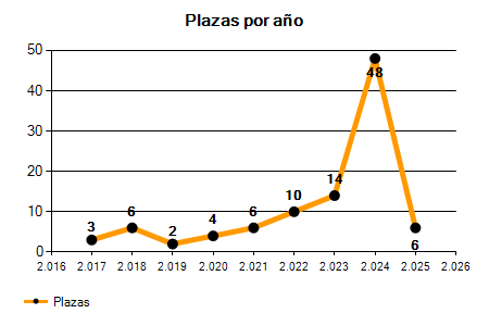 En los siguientes gráficos se puede ver la evolución del número de convocatorias y plazas convocadas por el ayuntamiento de San Fernando de Henares de los últimos años pudiéndose observar un crecimiento del 50,00% desde el año 2017 hasta el 2025 en número de convocatorias y un crecimiento del 100,00% en número de plazas convocadas.