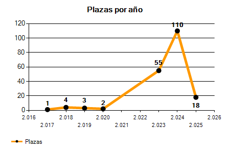 En los siguientes gráficos se puede ver la evolución del número de convocatorias y plazas convocadas por el ayuntamiento de Santa Pola de los últimos años pudiéndose observar un crecimiento del 250,00% desde el año 2017 hasta el 2025 en número de convocatorias y un crecimiento del 1.700,00% en número de plazas convocadas.
