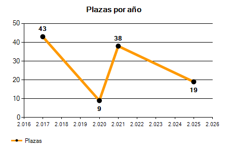 En los siguientes gráficos se puede ver la evolución del número de convocatorias y plazas convocadas por el ayuntamiento de Santiago de Compostela de los últimos años pudiéndose observar una caída del 7,69% desde el año 2017 hasta el 2025 en número de convocatorias y una caída del 55,81% en número de plazas convocadas.